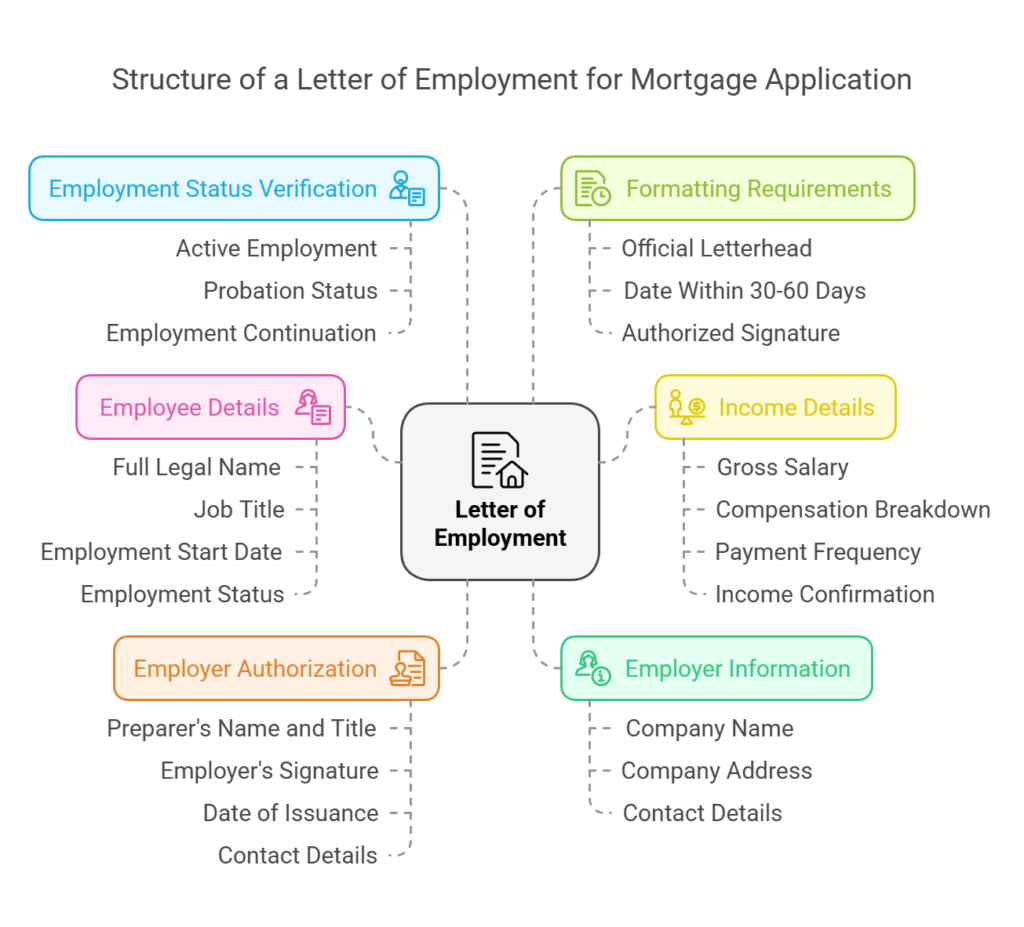 A Letter of Employment for a mortgage application in Canada should contain the following elements: