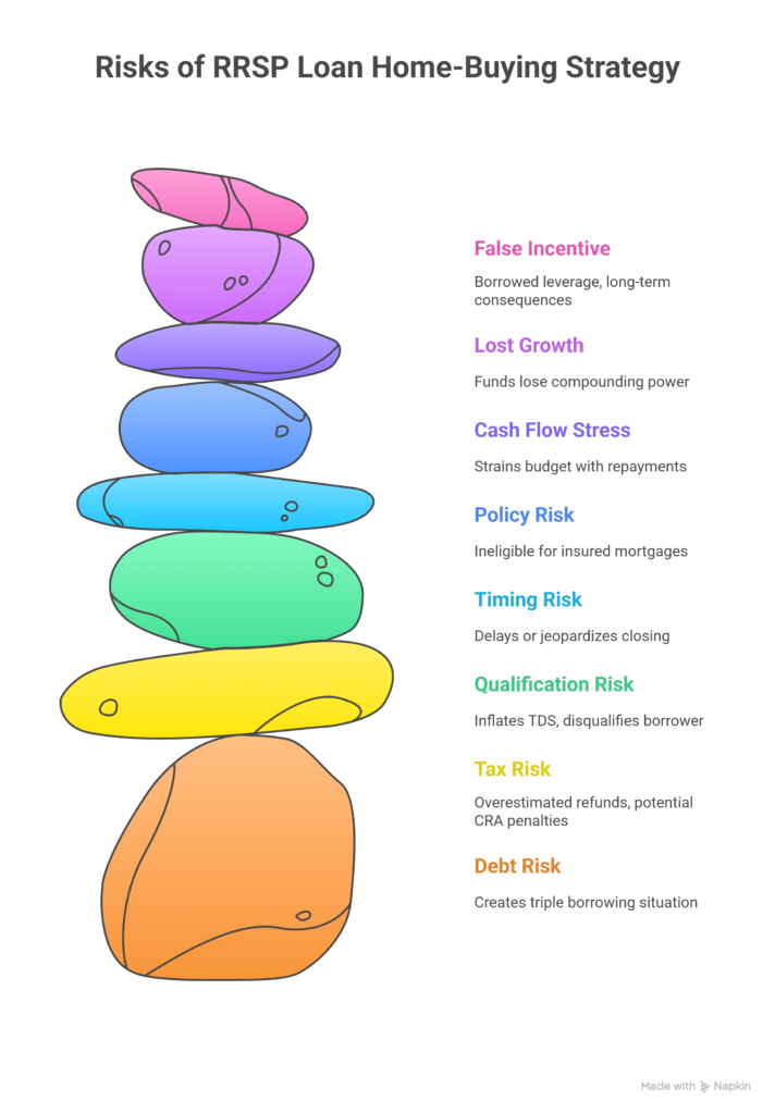 | Debt Risk | Creates triple borrowing — RRSP loan, RRSP Payback, and mortgage. |