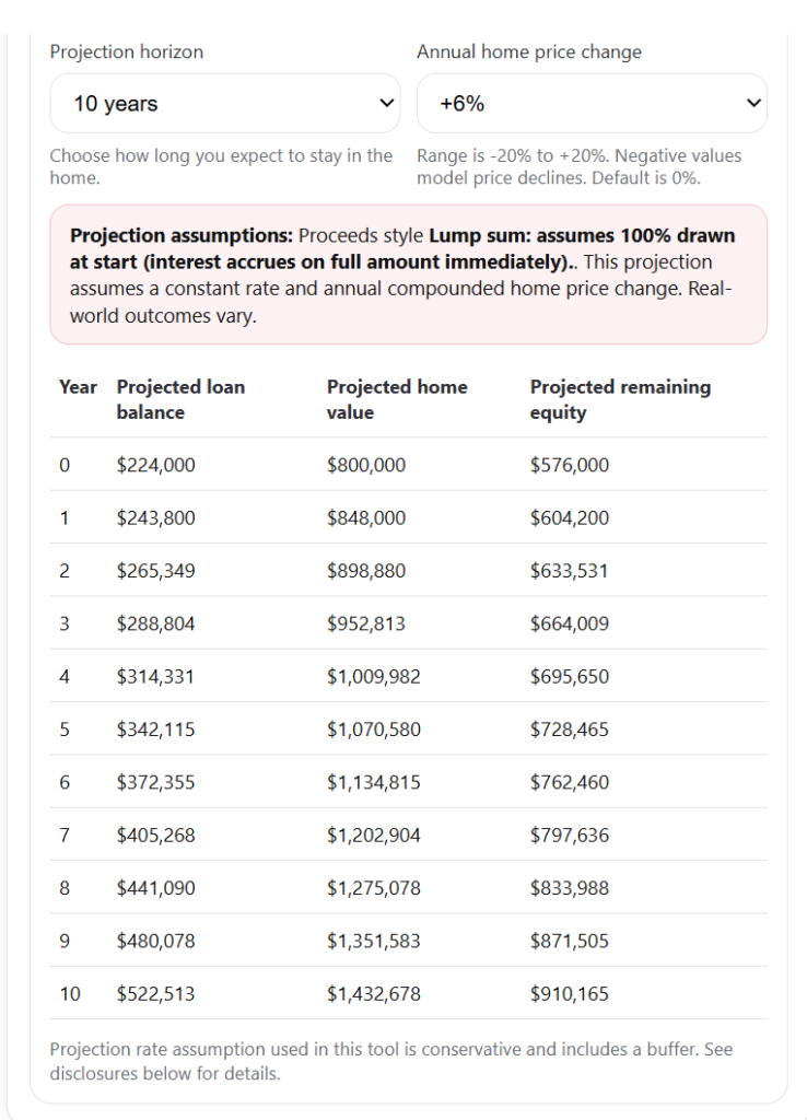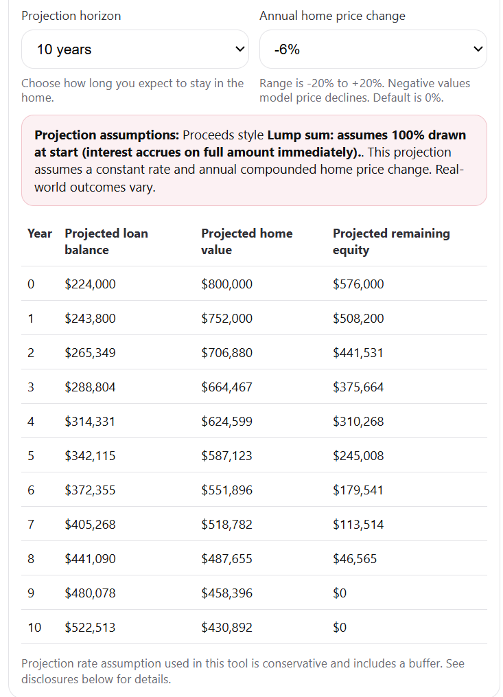 To compare assume over the next 10 years, home prices have decrease on average of 6 percent. This means if you took out a Reverse Mortgage then on a $800,000, not only would you have $224,000 in your pocket in an original lump sum payment (that would be generating income), but no remaining equity in your home.