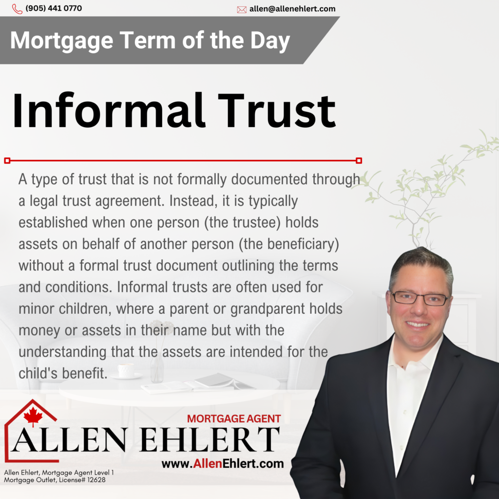An informal trust in Canada is a flexible, non-documented arrangement where one person holds assets for the benefit of another, often a minor child. These trusts can play a significant role in saving for a future down payment or helping with mortgage costs, thereby supporting the beneficiary’s path to homeownership. While informal trusts offer simplicity and flexibility, they also require careful management, especially in terms of tax implications and the eventual transfer of assets to the beneficiary when they reach the age of majority. Understanding how an informal trust can be used in relation to mortgages is crucial for effective financial planning and supporting the next generation in achieving homeownership.