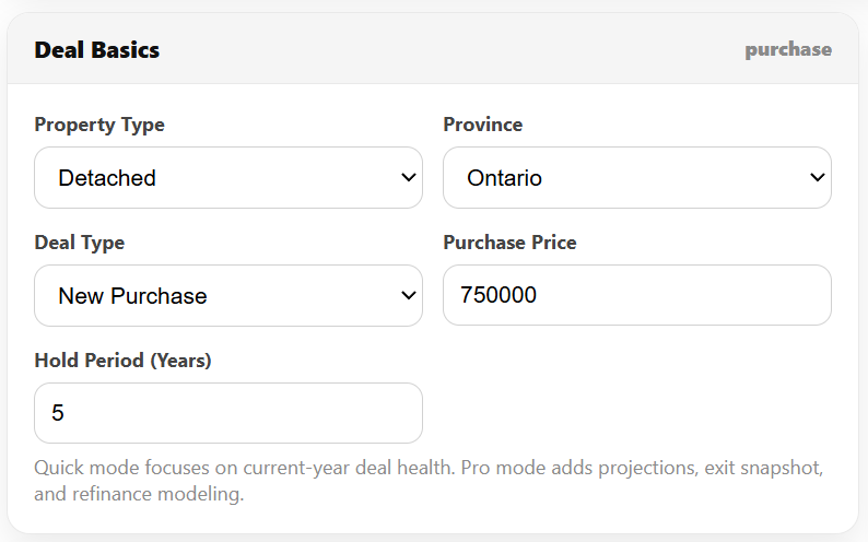 • Deal Context (Purchase vs. Refinance): Select “New Purchase” for a fresh buy, or “Refinance” for an existing property.