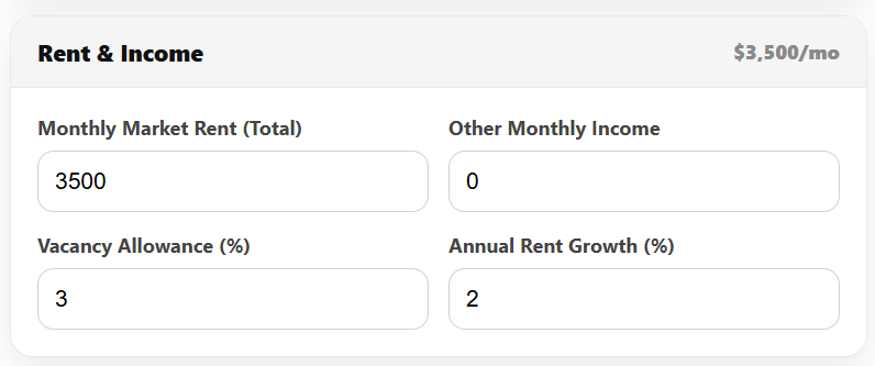 • Vacancy Allowance (%): Percent of gross potential income assumed unoccupied.