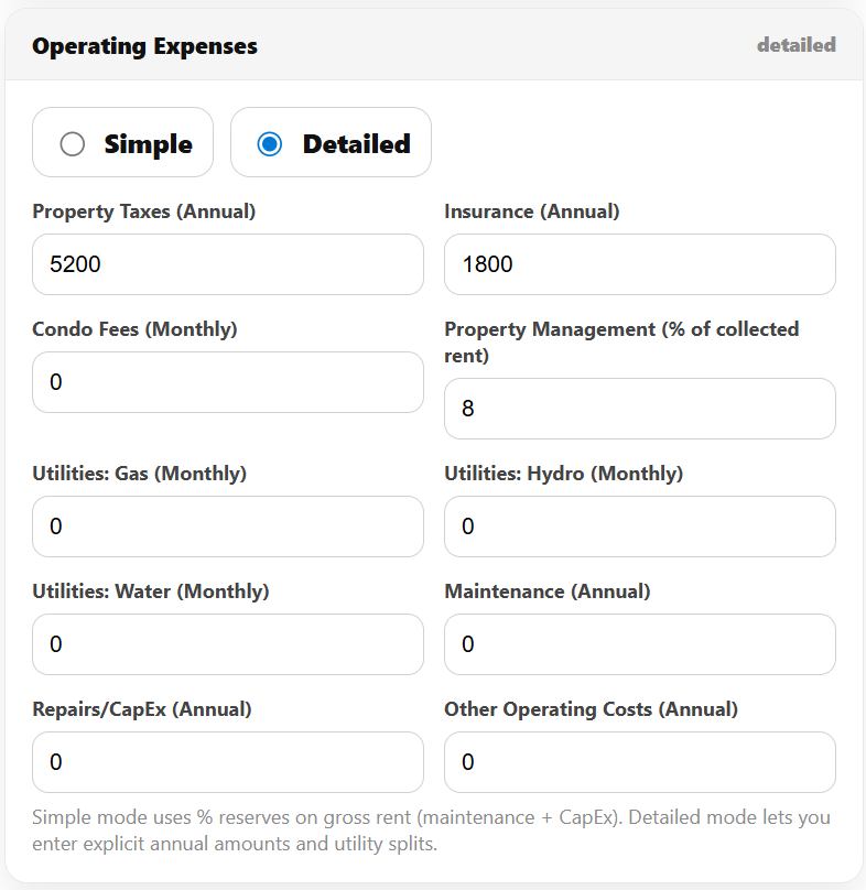 A: For quick screening, Simple mode is easier (uses % reserves). Detailed mode is for when you have firm numbers (e.g. tax bills vs. estimated reserves). Always double-check no expense (like vacancy or utilities) is left at 0 unless true.