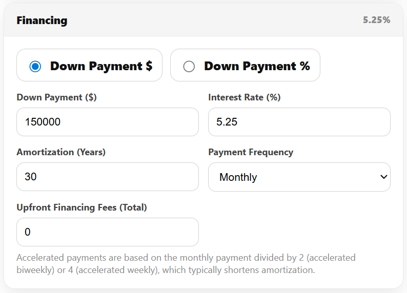 • Amortization (years): Mortgage amortization period (5–30 years).