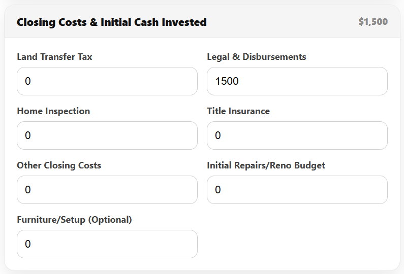 • Upfront Financing Fees (total): Any lump-sum mortgage fees (appraisal, legal, points, mortgage insurance) you pay. Add to cash invested.