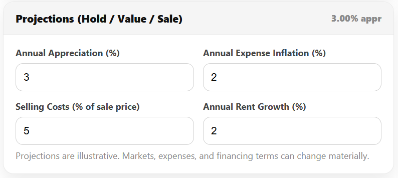 • Hold Period (years): The intended time you plan to own before selling. Common ranges: 3–5 years (short hold) or 5–10+ years (long hold).