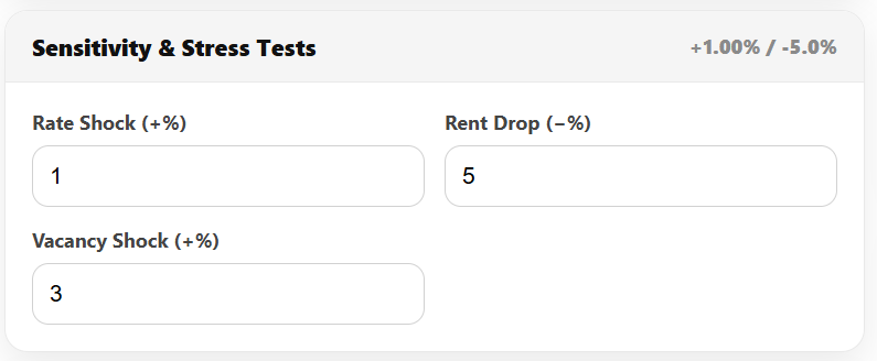 4. If Cash Flow ≥ $0 (or profile target) and DSCR ≥ ~1.1 (for Balanced) and CF holds under shock, the deal may work. Otherwise, likely too tight.