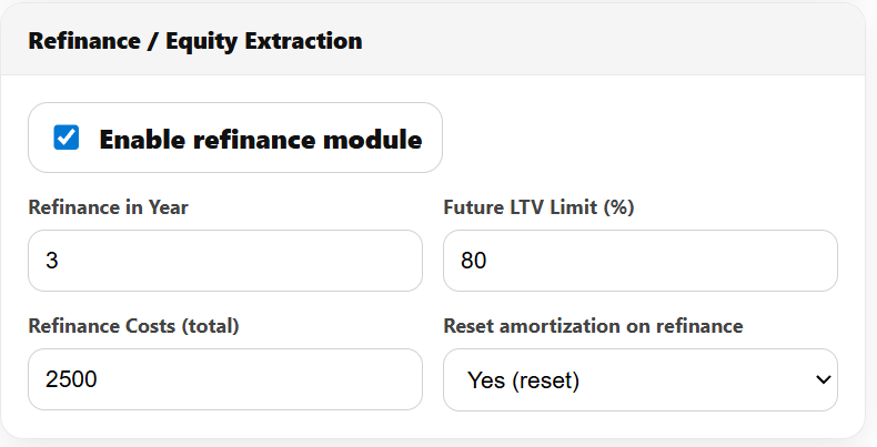 Common pitfall: Entering purchase price instead of current value on refinance deals. This can double-count price and distort LTV. The tool hides the wrong fields based on context – ensure only relevant fields are shown.