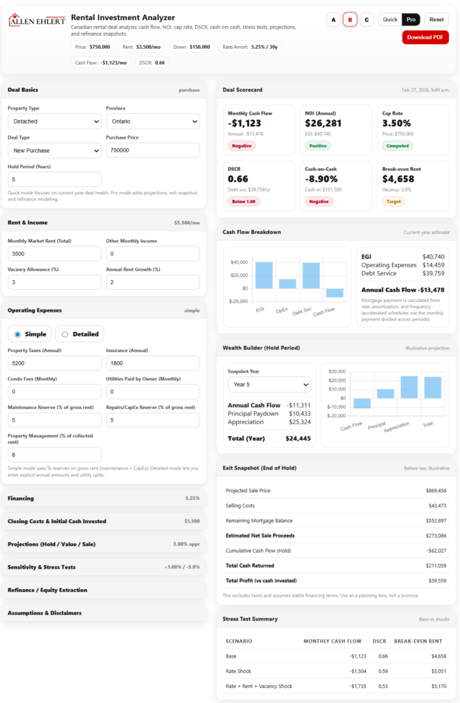4. Rebalance in Refinance: In Pro Mode, set Refi Year (often 1 or 2) and assume 80%+ LTV (subject to CMHC rules).