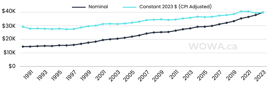 Here’s where the rubber meets the road. Over the past few decades, wage growth in Canada has limped along at about 2–3% annually. Meanwhile, real estate in many markets — Toronto, Vancouver, even smaller Ontario towns — has doubled or tripled in price.