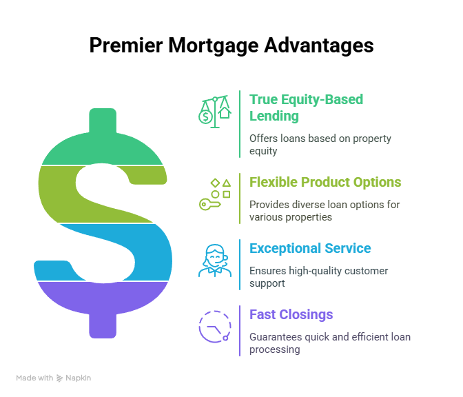Premiere Mortgage stands apart as a true equity lender, meaning their lending decisions are based primarily on the value and quality of the real estate — not the client’s income, employment status, or credit score.