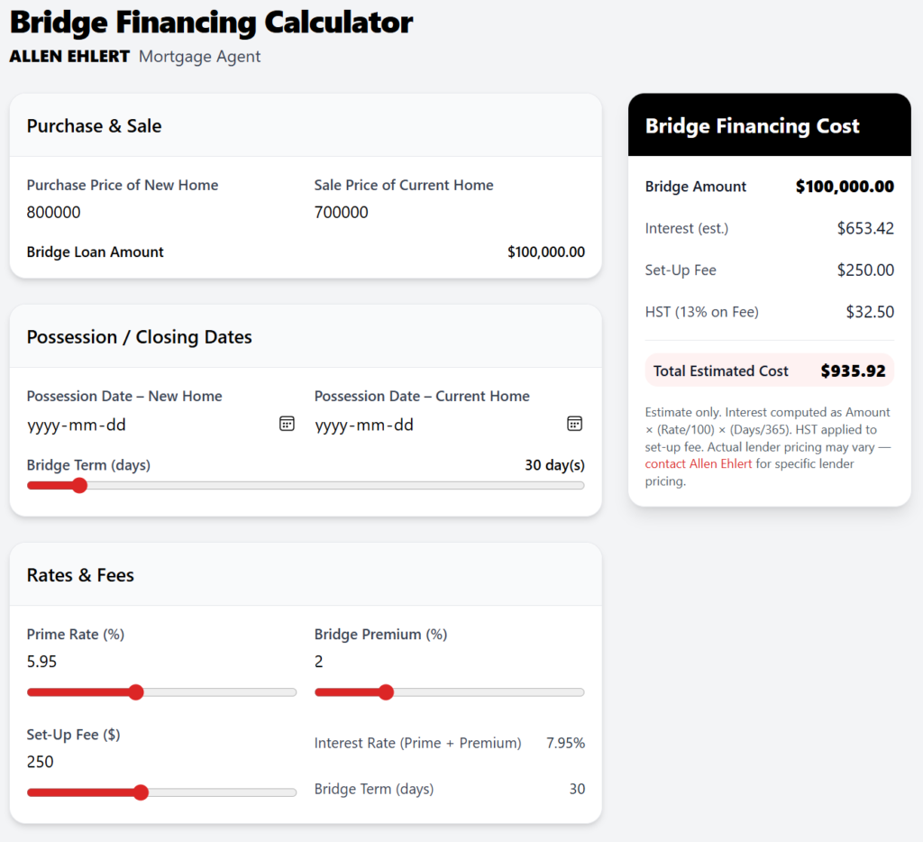 For my clients, this tool is a sanity-saver. Imagine you’re upgrading from a condo to a detached home. Your new place closes on June 1st, but your buyer can’t close on your condo until June 15th. That’s a two-week gap. With the calculator, you can punch in your numbers and instantly know approximately what that 14-day bridge loan will cost you. No surprises.