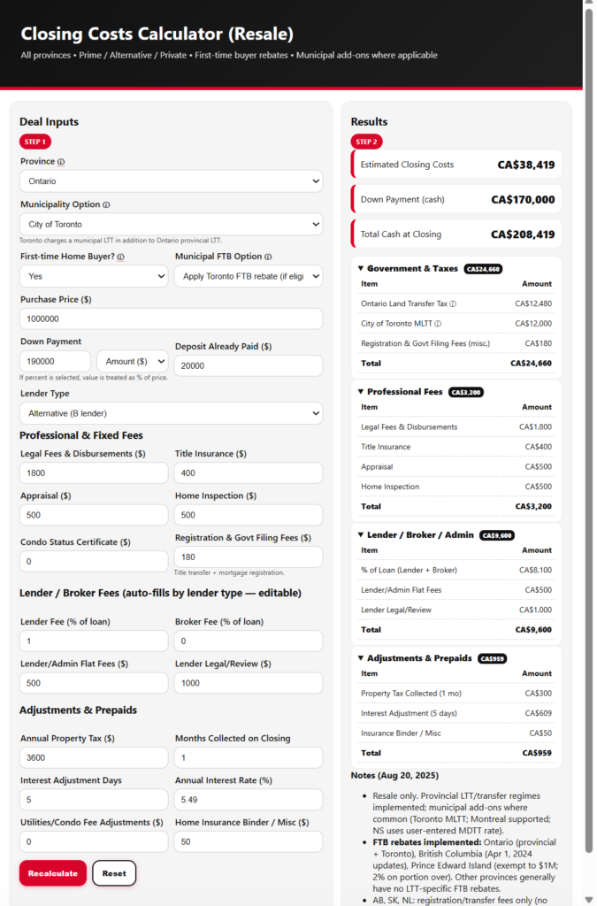 Lisa, a first-time buyer in Whitby, was over the moon about her $650,000 townhouse. She thought her 5% down payment was all she needed. A quick run through my Closing Costs Calculator showed her she’d need another $12,000 for things like land transfer tax (after her first-time buyer rebate), legal fees, and prepaid taxes.