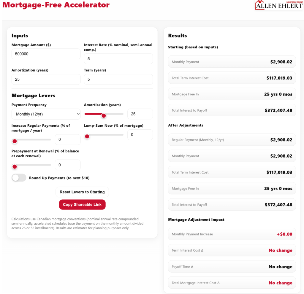 That’s where Allen Ehlert’s Ultimate Canadian Mortgage-Free Accelerator Calculator comes in. This tool lets you see the impact of even the tiniest adjustments to your mortgage so you can make informed choices that accelerate your path to financial freedom.
