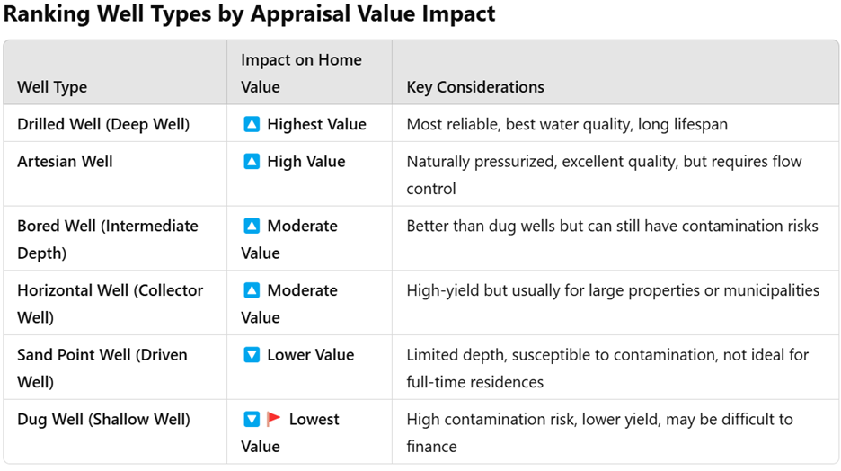 As a home appraiser in Canada, the type of well on a property can significantly impact its appraisal value. The well’s reliability, water quality, longevity, and maintenance costs all factor into how lenders, buyers, and insurers assess the home’s worth.