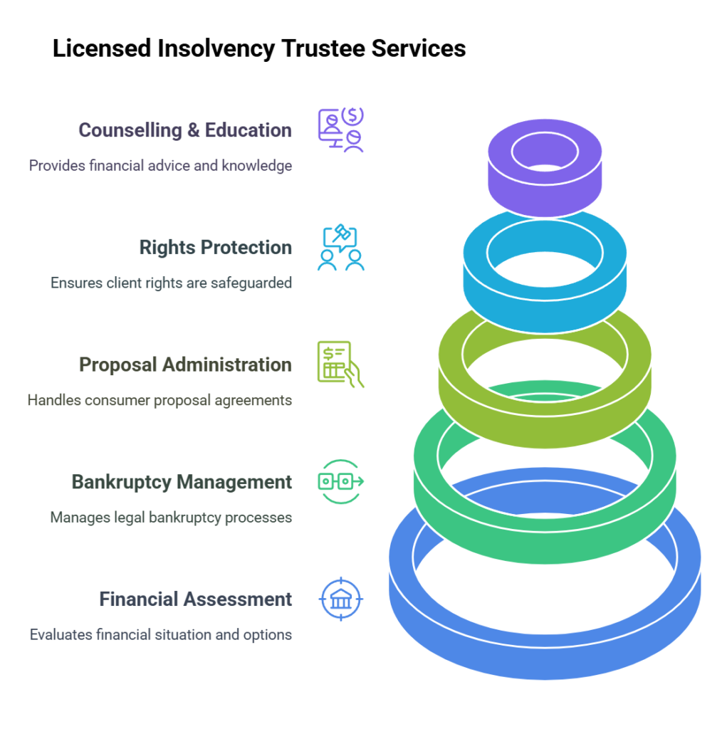 Licensed Insolvency Trustees provide financial counselling and education as part of insolvency proceedings. They conduct mandatory counselling sessions to help debtors improve financial literacy, develop stronger money management skills, and rebuild credit. Trustees provide practical strategies designed to help debtors avoid future debt problems and establish long-term financial stability.